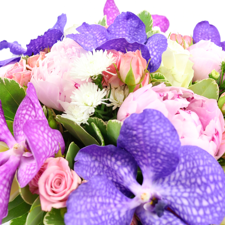 Immerse yourself in the charm of a bouquet that blends the soft hues of pink and purple into a captivating celebration of nature.